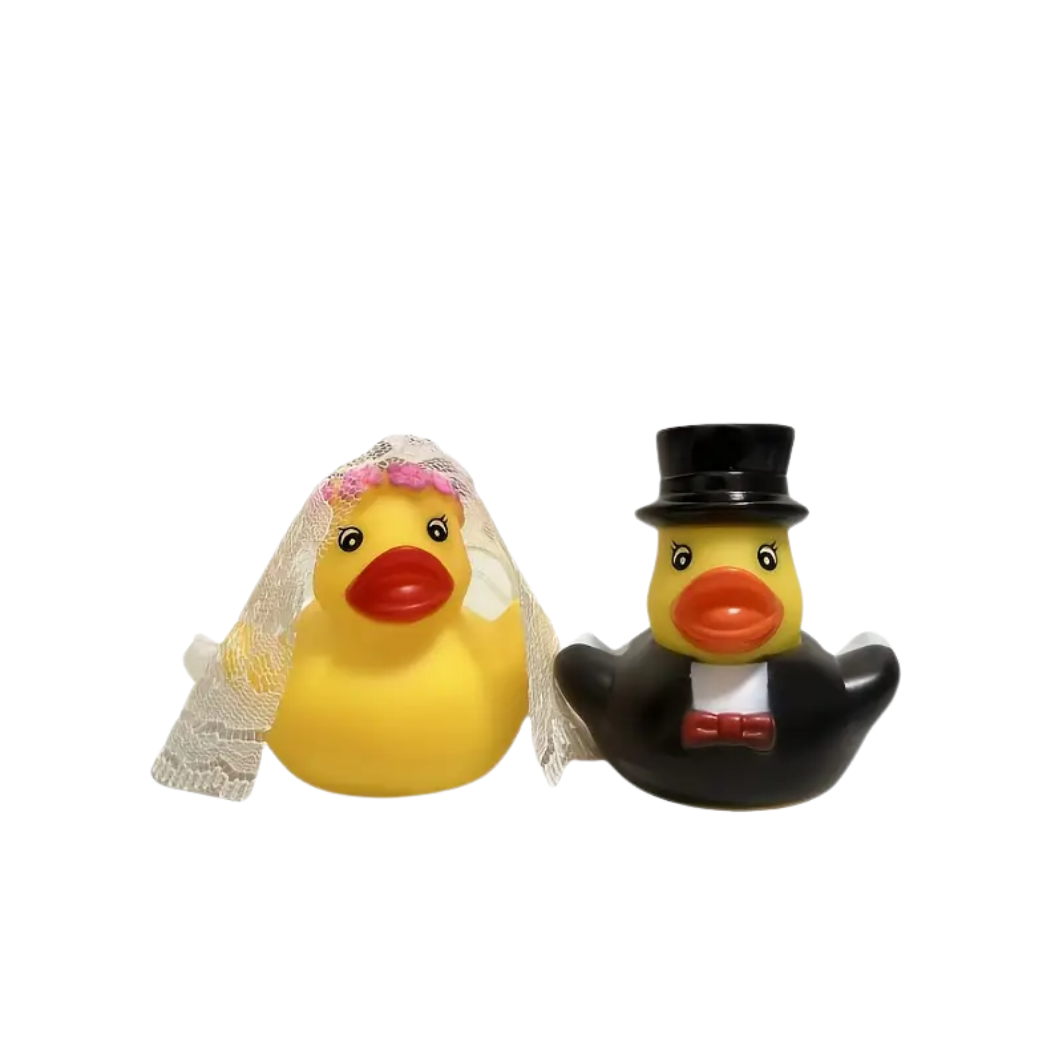 Wat is nou leuker op de bruilofts-taart of als cadeautje dan een bruid en bruidengom in eendenvorm?!