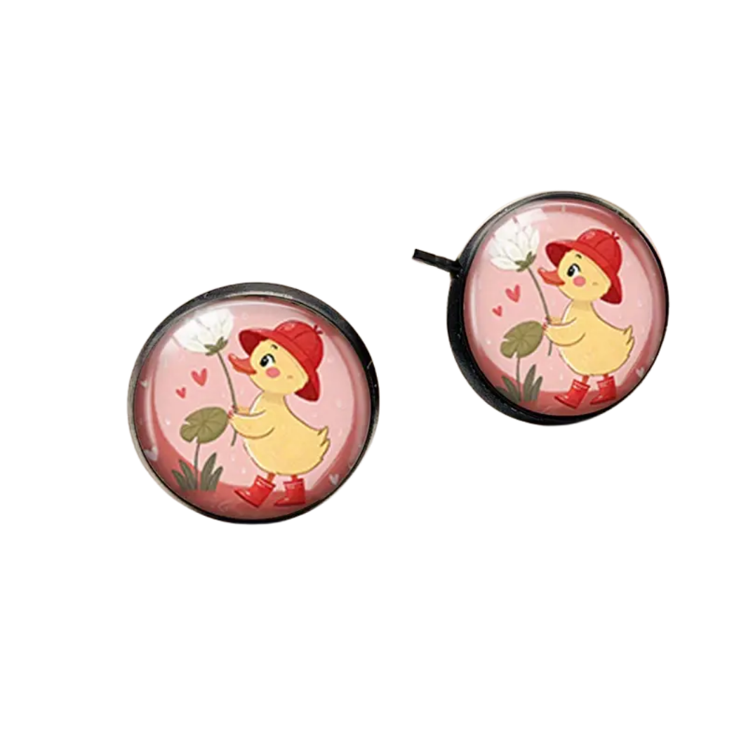 Met deze cute retro eendenoorbellen ben jij helemaal klaar voor de herfst of lente! De schattige eendjes met regenhoed en laarzen zijn de perfecte finish van jouw eendenstijl. Pastel roze en geel, afgemaakt met warm rood. De oorbellen zijn licht van gewicht en dus fijn te dragen.