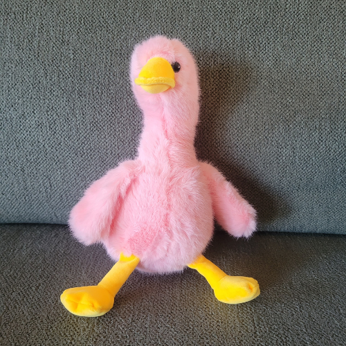 Let op: knuffeltje is lichtroze, maar feller van kleur dan op afbeelding 1 te zien is. Het snaveltje is geel-oranje van kleur. Zie foto 2 voor de kleurechte vrolijkheid.